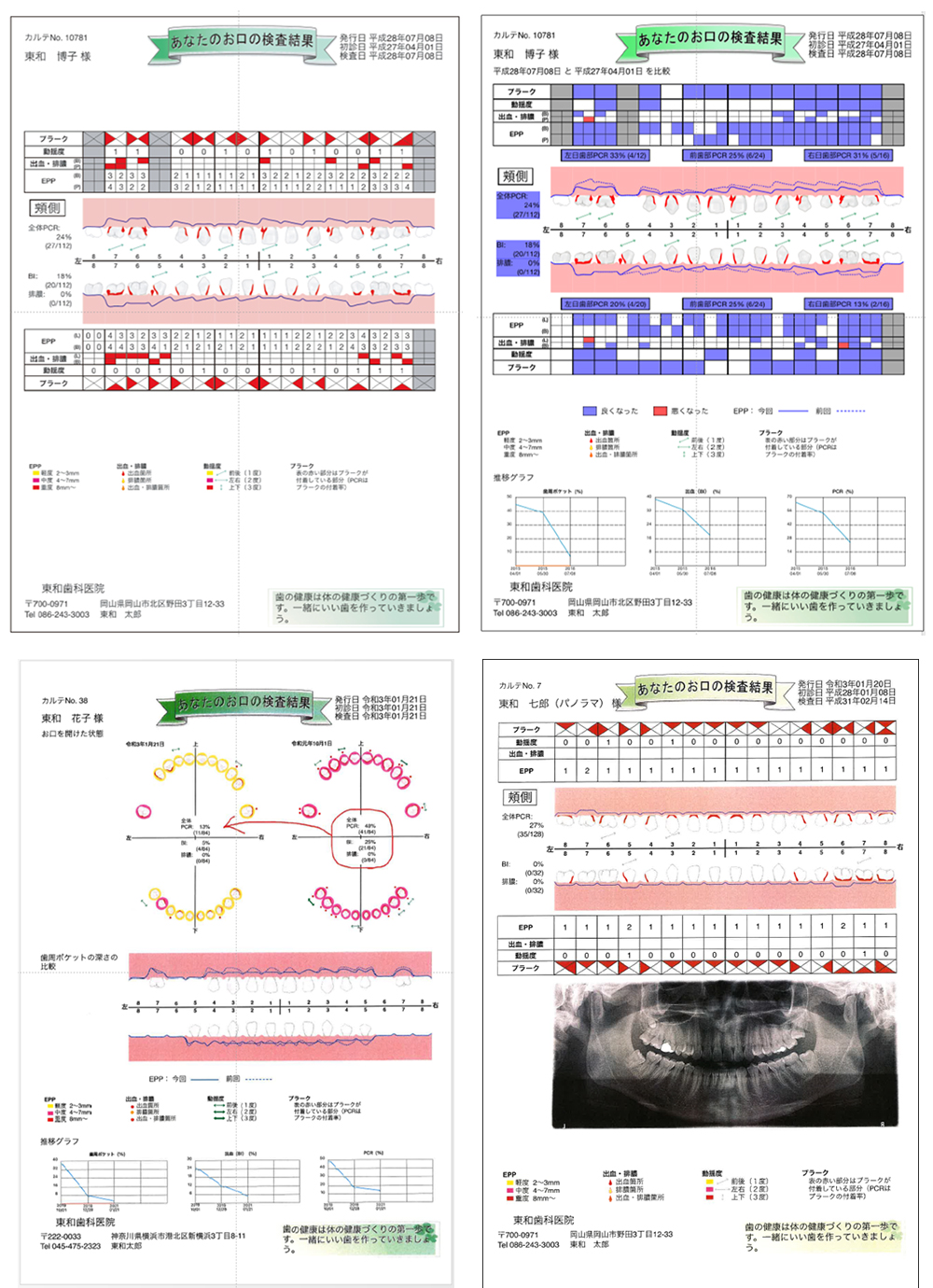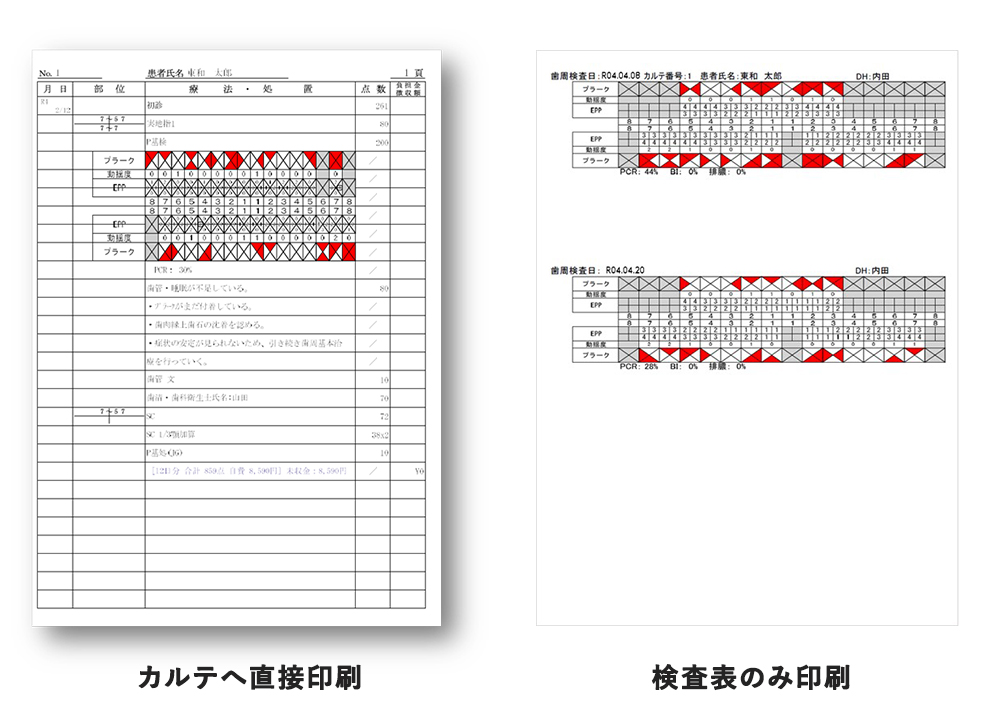 チェアサイドで登録した検査情報は、治療説明資料、カルテ2号紙 歯周検査印刷、指導箋の歯式、